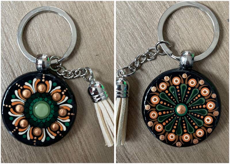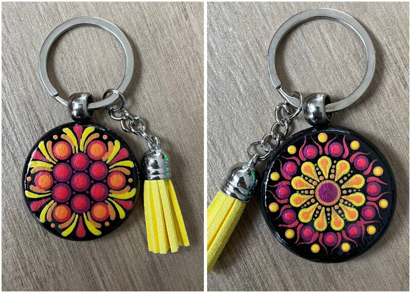 Die Schlüsselanhänger sind aus Holz und mit einem Schutzlack versiegelt. Sie sind beidseitig bemalt und haben einen Durchmesser von ca. 4cm.